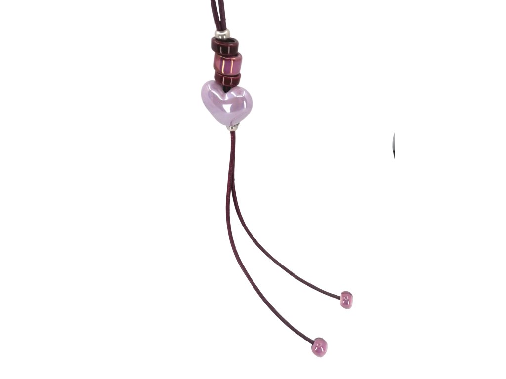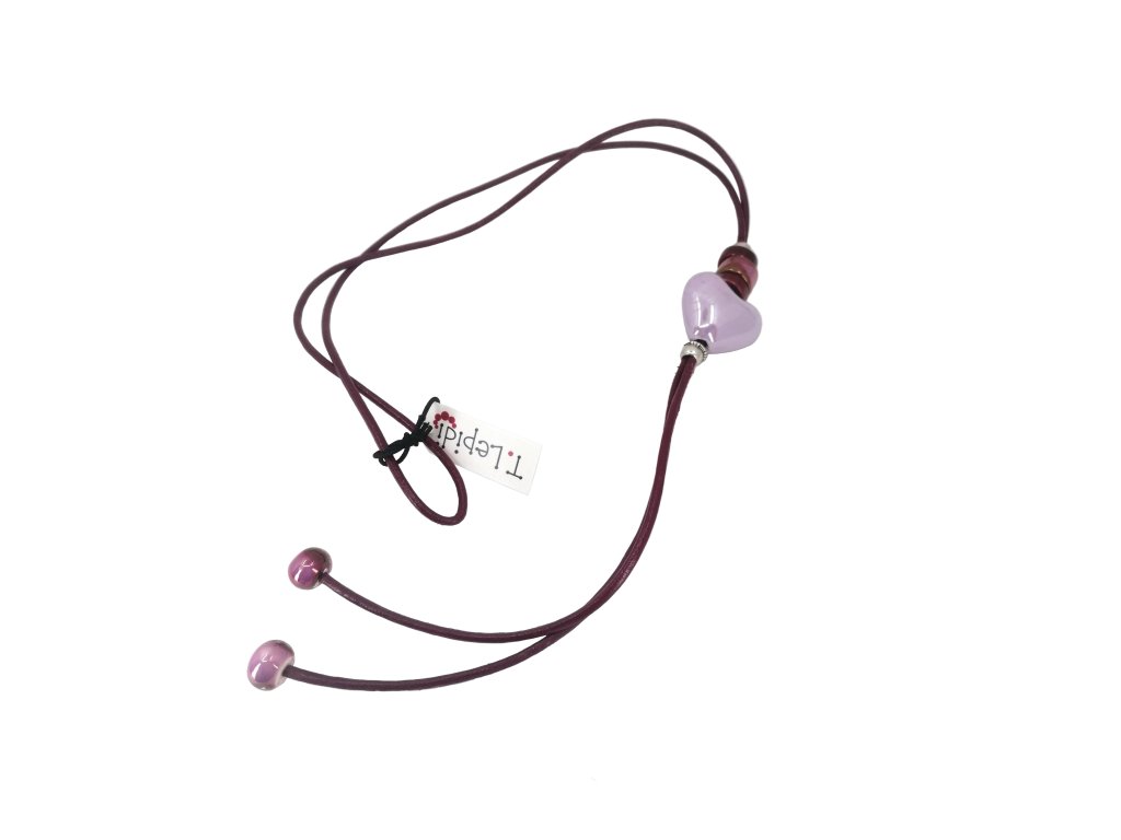 Přívěšek ze světle fialového korále ve tvaru srdce, tmavě fialových korálů na tmavě fialové kůži.
