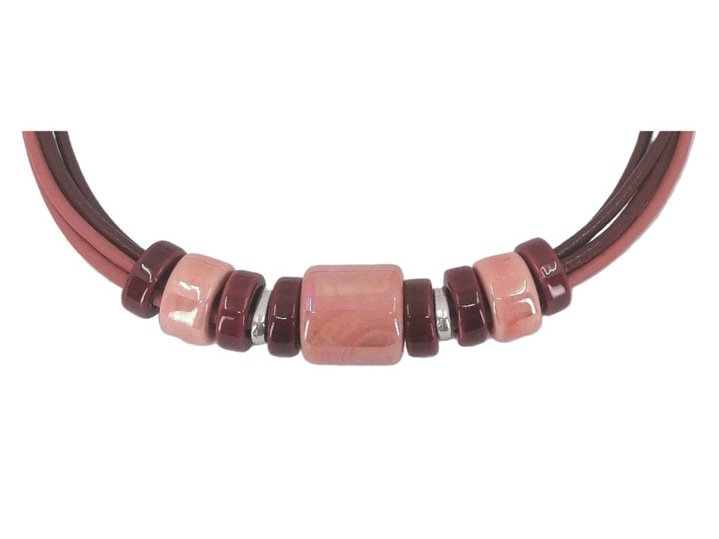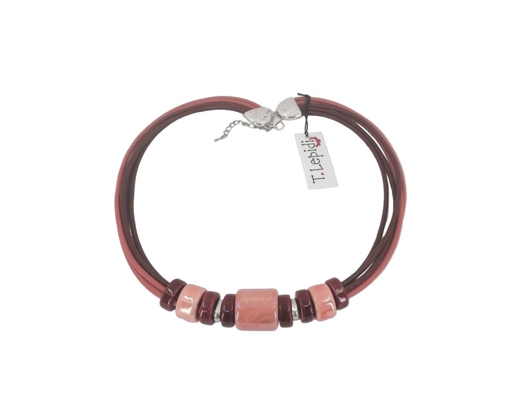 Náhrdelník s červenými a lososovými kameny na staro-růžové a hnědé kůži