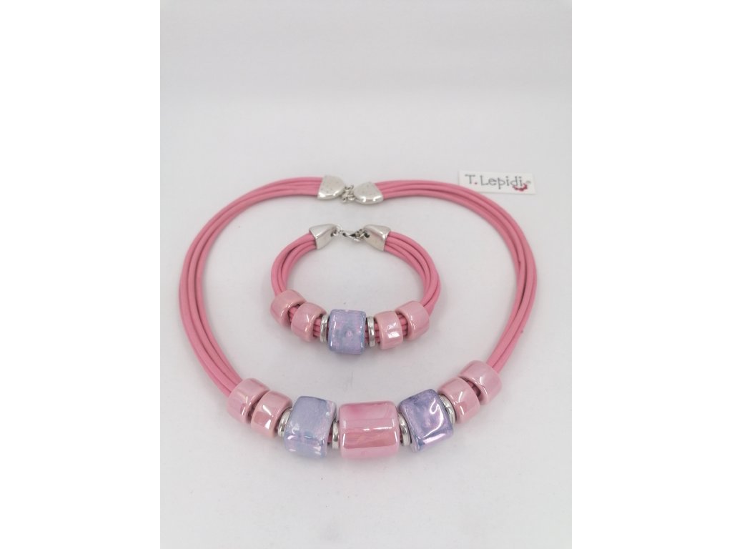 Náhrdelník a náramek z růžových a fialových korálů na růžové kůži.