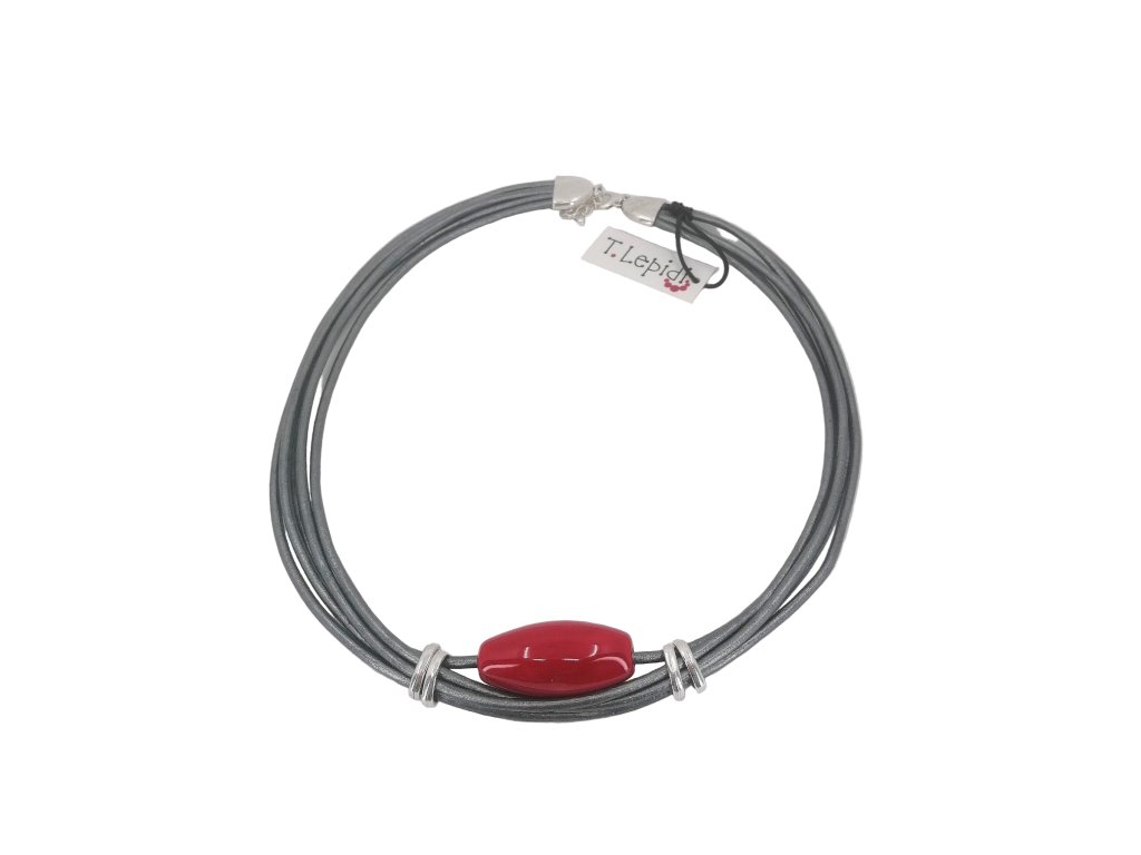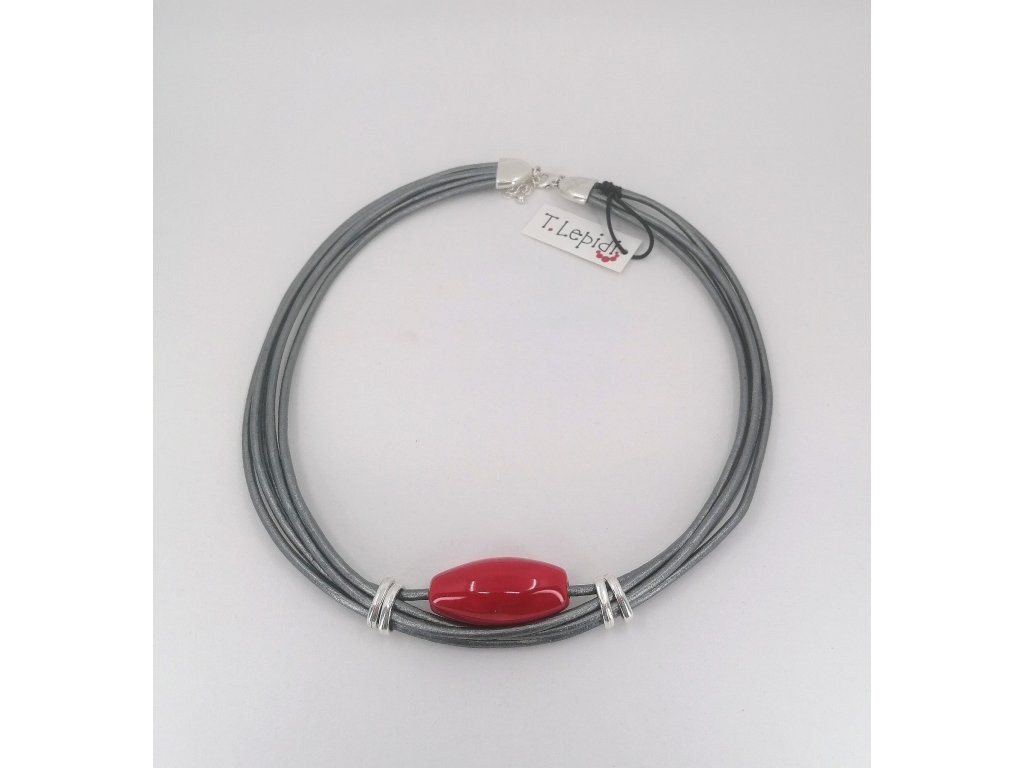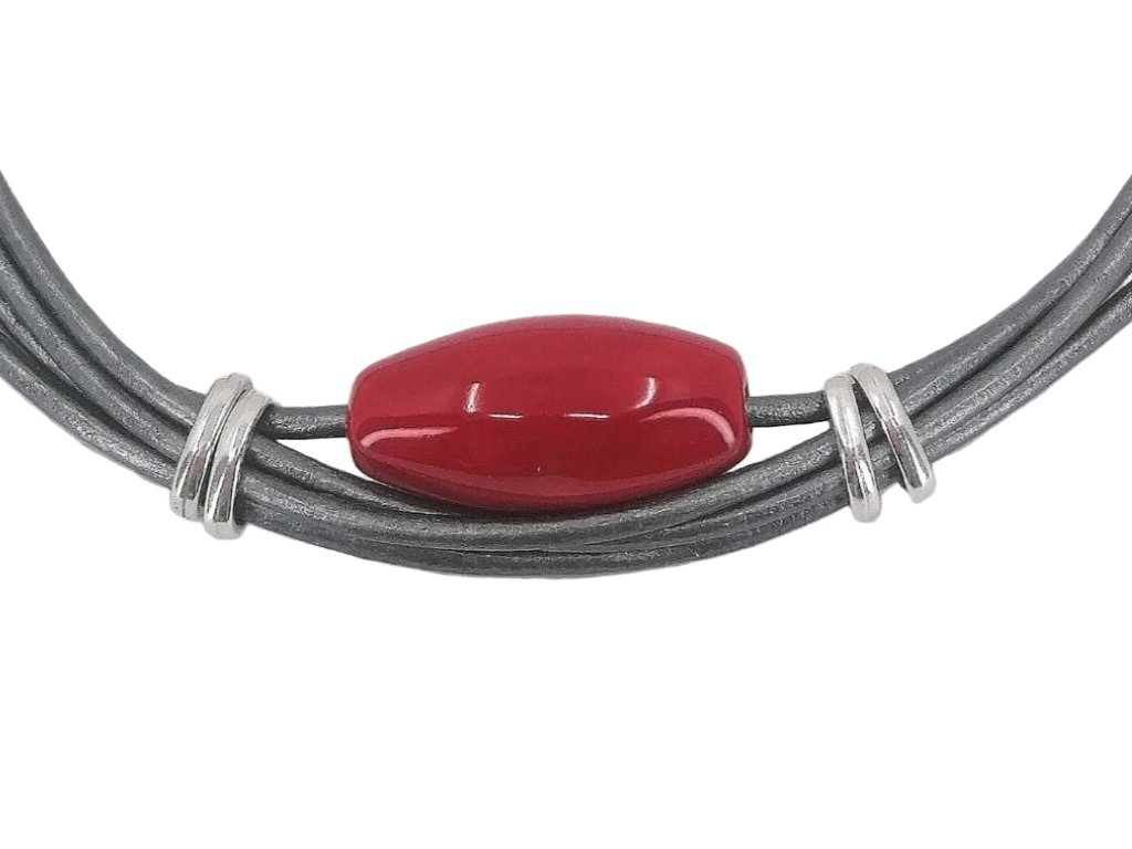 Náhrdelník s červeným keramickým korálem na tmavě šedé kůži