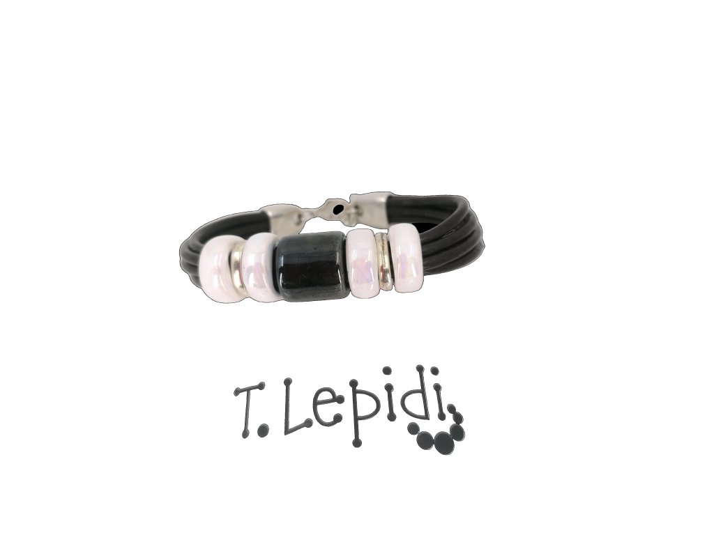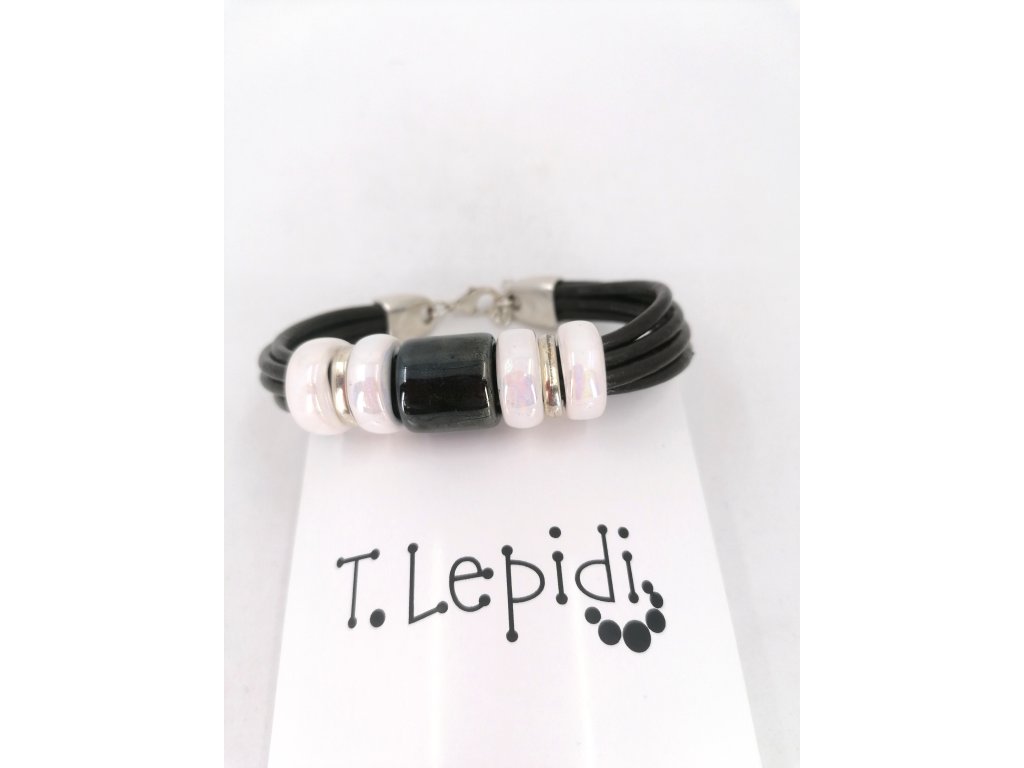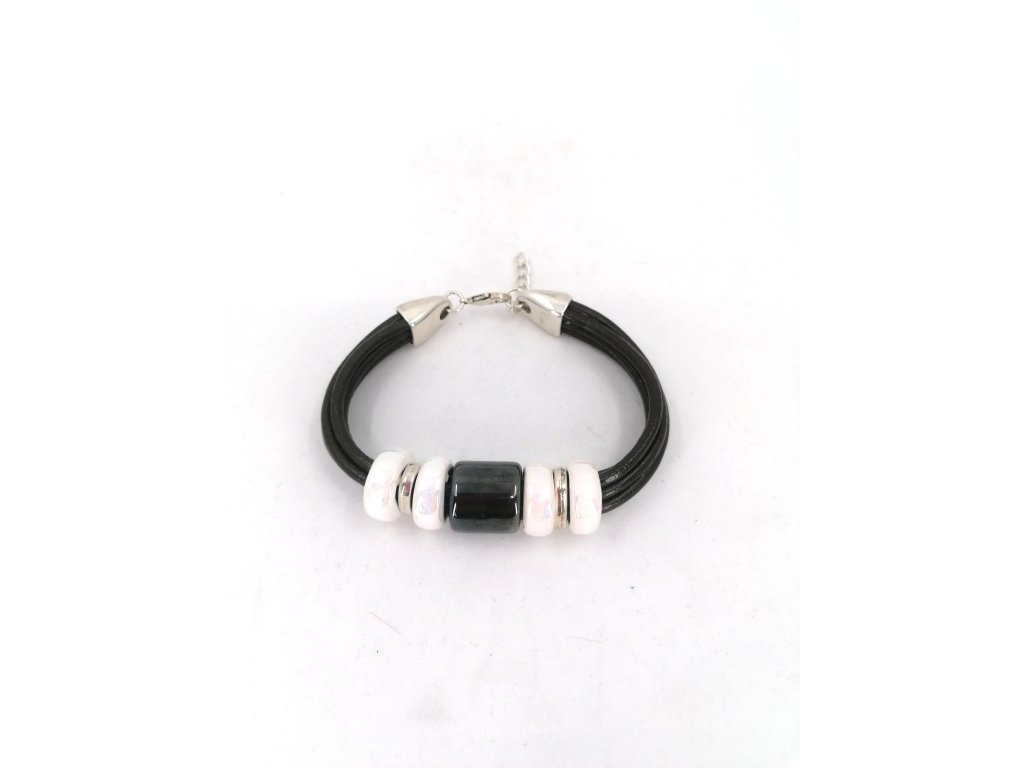 Náramek z černé kůže s černým a bilými korály.