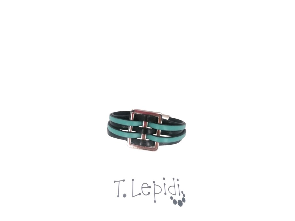 náramek z černé a světle modré kůže s kovovým ornamentem.