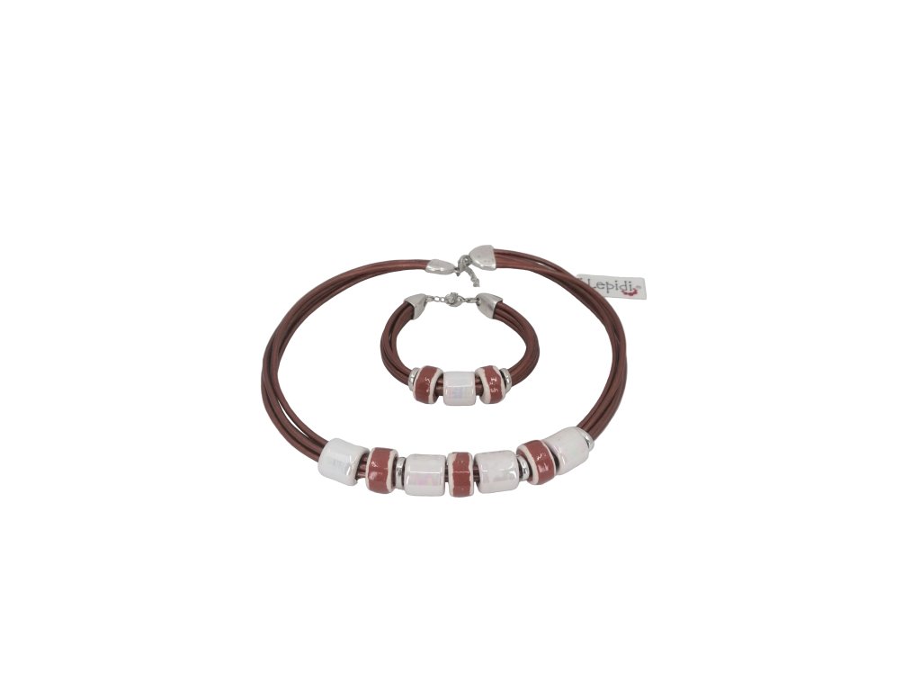 Náhrdelník a náramek z bílých a bílo hnědých korálů na hnědé kůži.