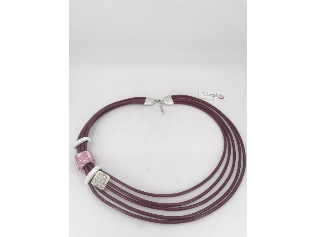 Náhrdelník s růžovými a bilými korály na červené kůži.