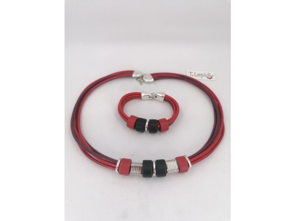 Náhrdelník a náramek s červenými a černými korály na tmavě a světle červené kůži.