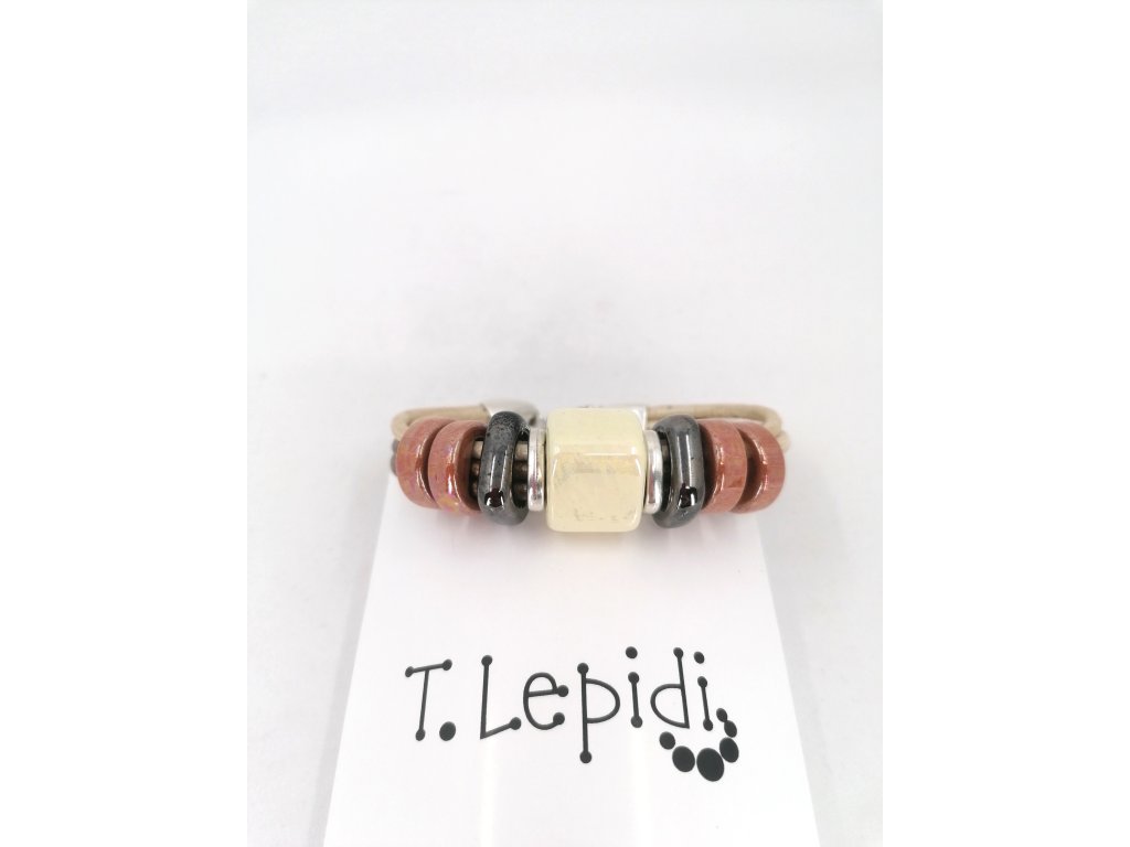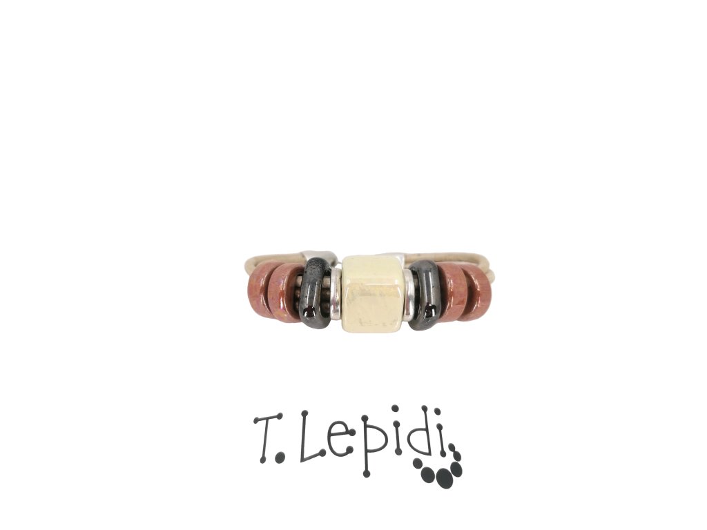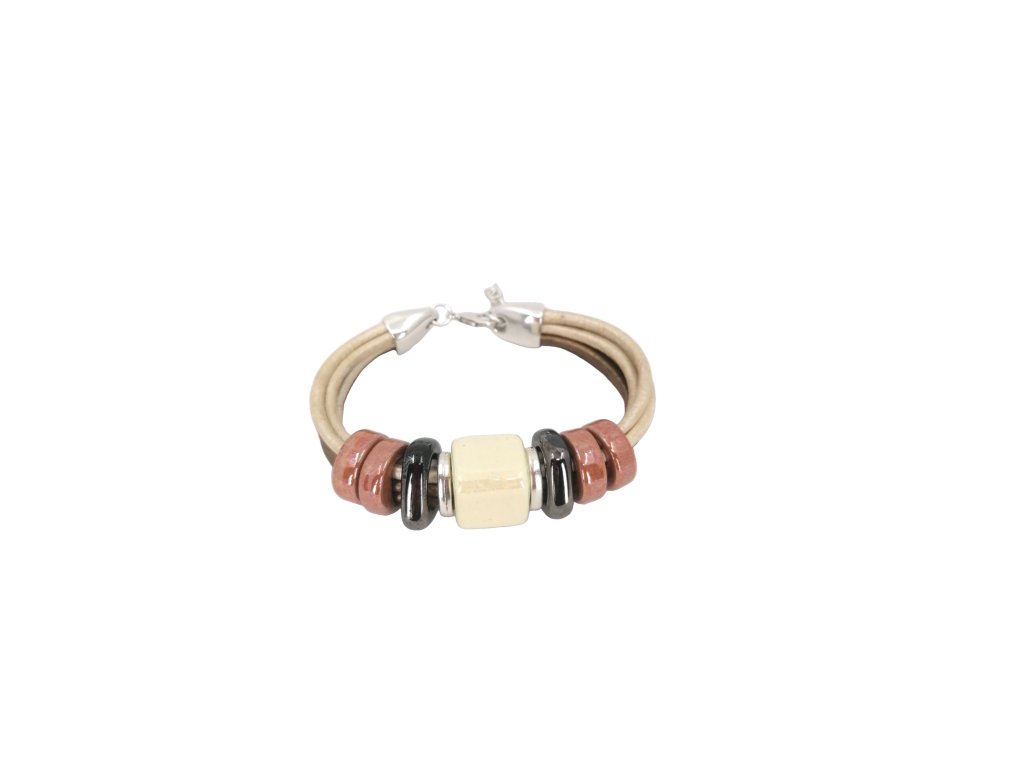 Náramek z hnědé kůže a vanilkových, černých a červených korálů.