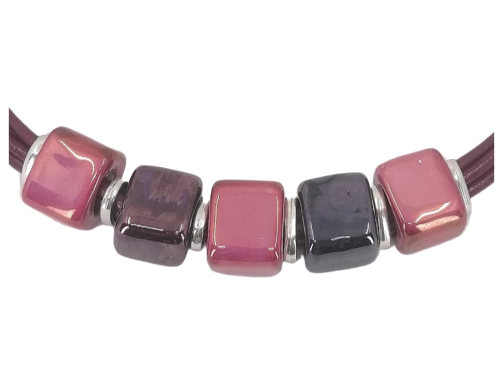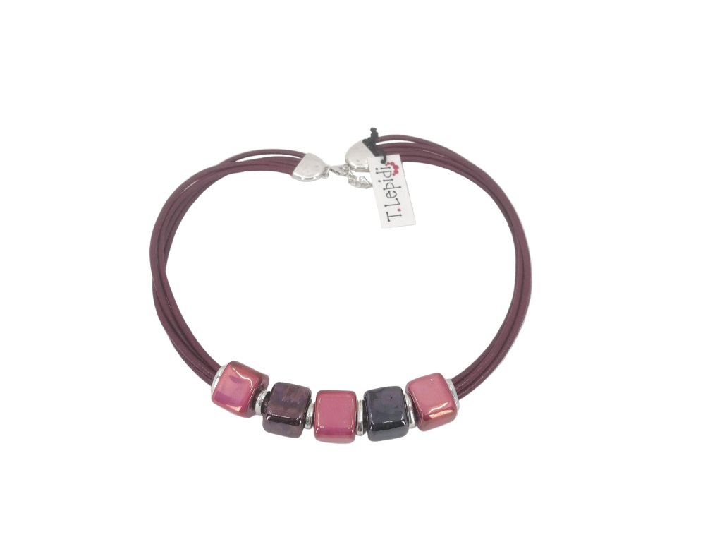Náhrdelník s tmavo růžovými a fialovými kameny na bordo kůži.