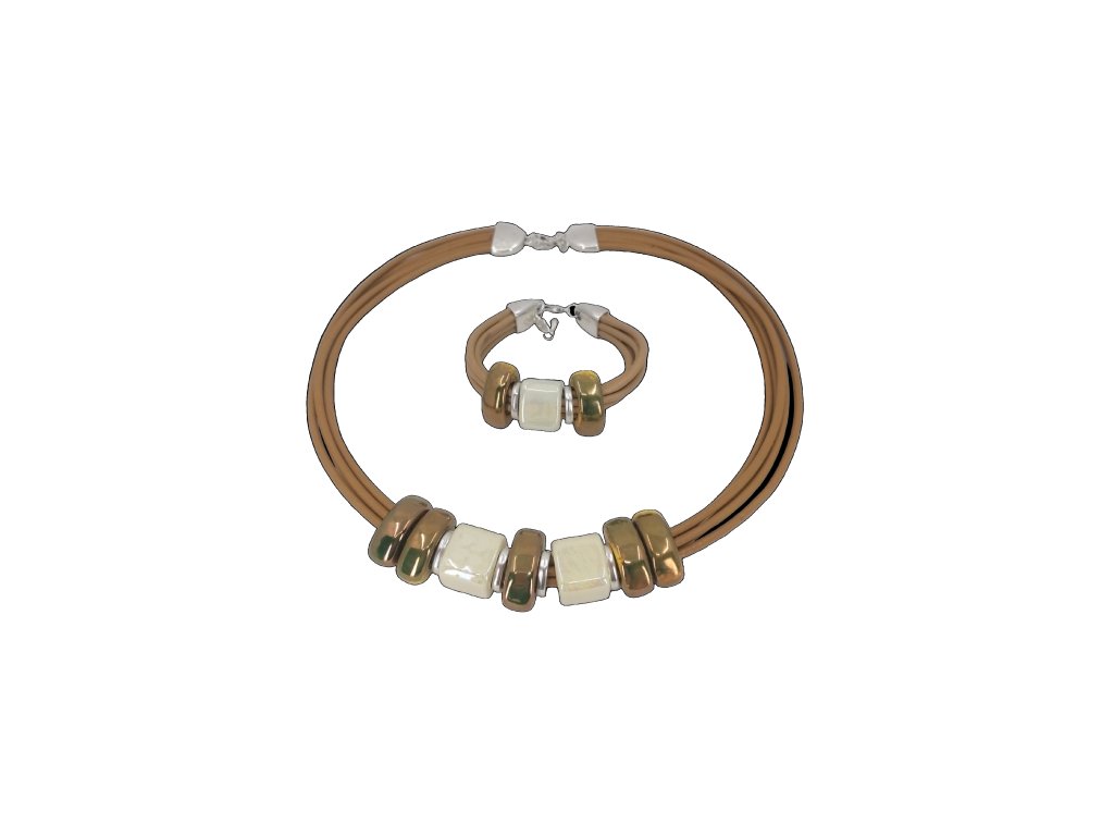 Šperky jsou vyrobeny z kůže, ručně malovaných keramických korálů a postříbřených komponentů bez obsahu niklu a kadmia.