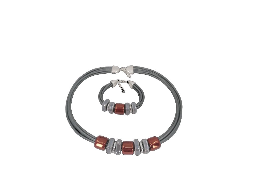 Náhrdelník a náramek s Bronzovými a šedými kameny na šedé kůži.