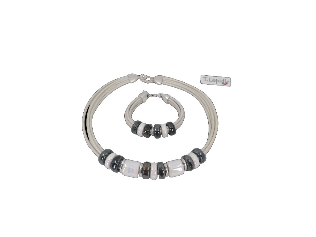 Šperky jsou vyrobeny z kůže, ručně malovaných keramických korálů a postříbřených komponentů bez obsahu niklu a kadmia.